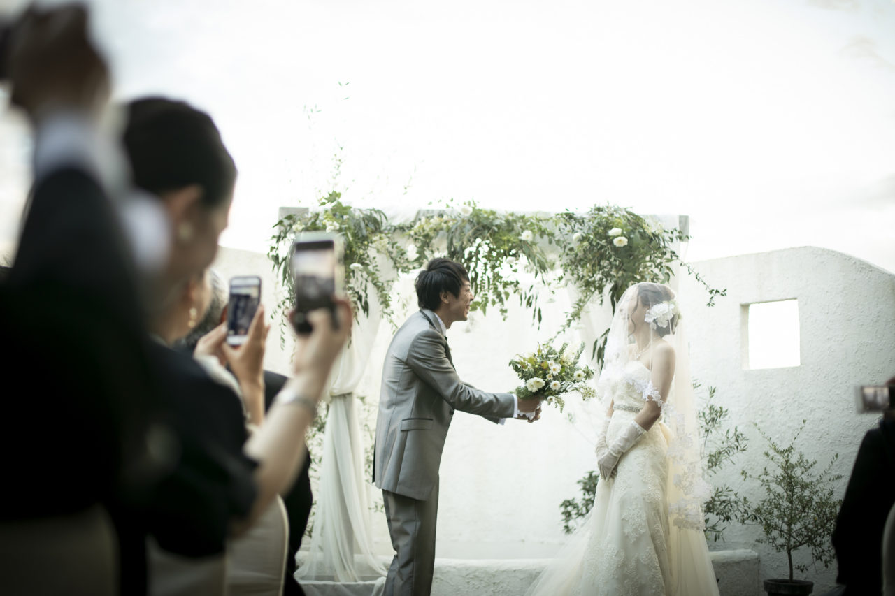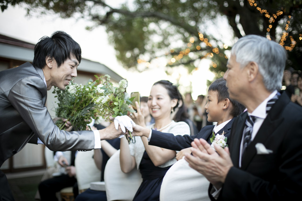 新郎様が新婦様にブーケを渡すと、新婦様はブーケから一つ花を抜き取り新郎の胸ポケットに入れ挙式スタート。