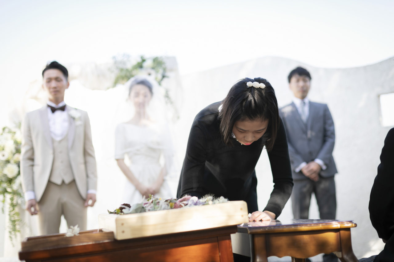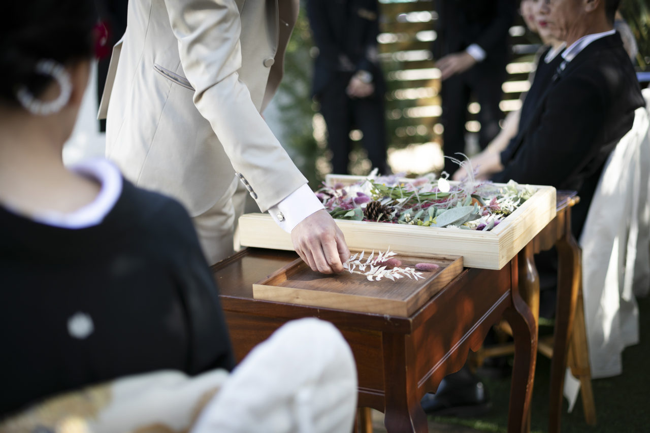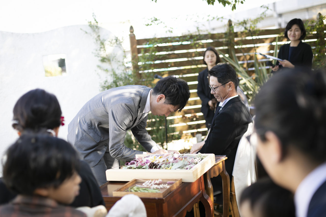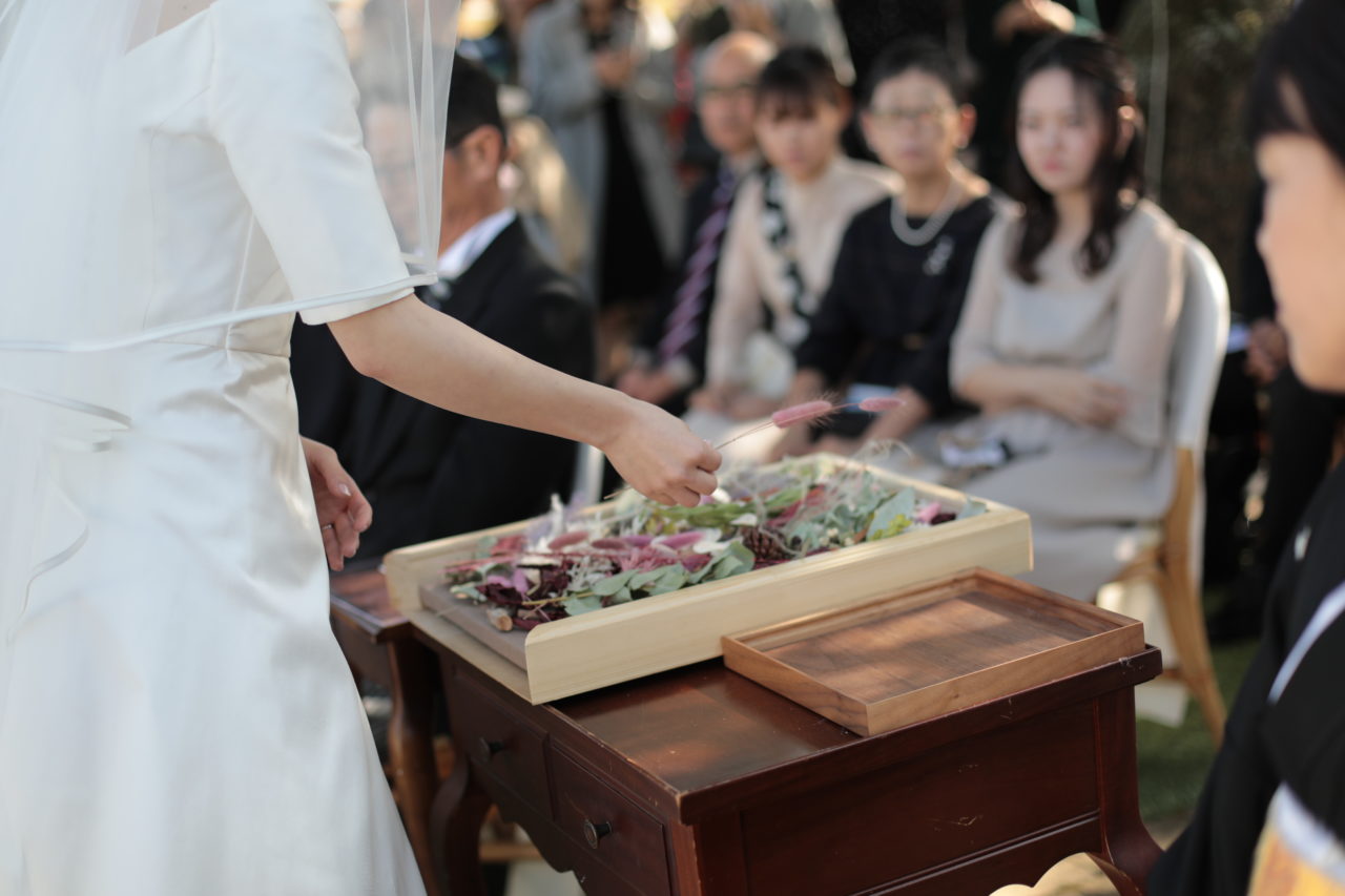人前式の中で皆様の前で誓いの意味を込めてお二人も花を詰め